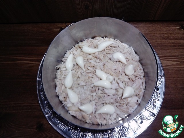 1 слой - куриная грудка + майонез (солим по вкусу) -