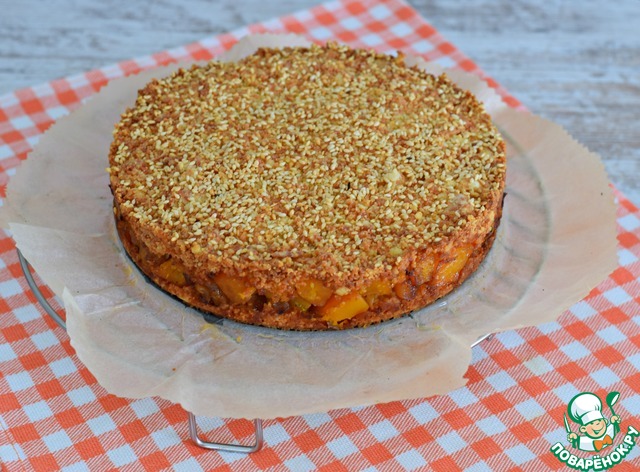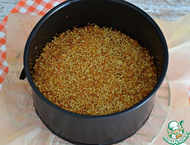 Сверху выложить вторую часть теста-крошки. Разровнять, немного утрамбовать. Посыпать пирог кунжутом. (по желанию)