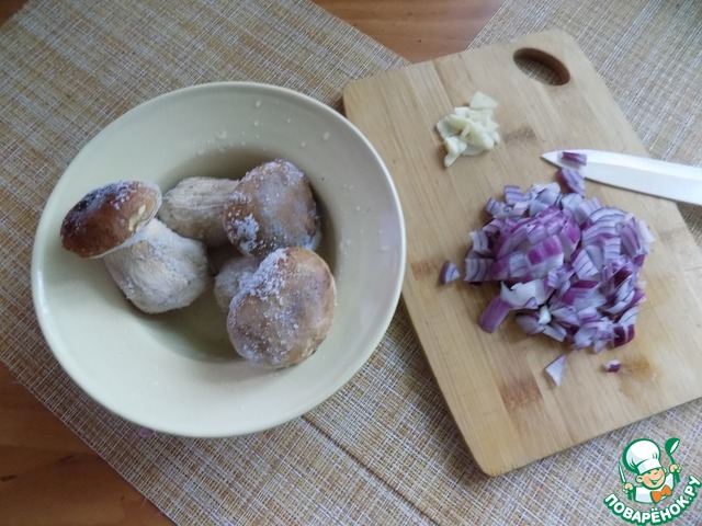 Картофель ставим варить, чтобы сделать из него пюре. Готовим продукты. Грибы я взяла белые. Небольшие грибы я замораживаю в морозильнике целиком по 4 шт в пакете. Разморозила их.