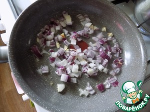 Пока варится картофель, делаем начинку. В сковороде обжариваем в масле мелко порубленный чеснок с минуту. Затем выкладываем лук. Обжариваем до мягкости.