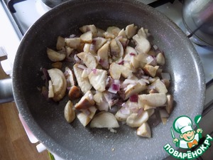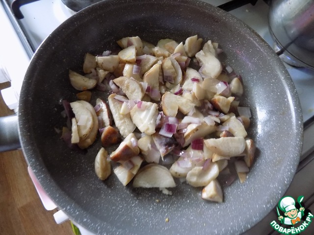 Выкладываем грибы. Белые и шампиньоны перед обжаркой я не отвариваю. Остальные грибы предварительно нужно отварить. Обжариваем грибы до полного выпаривания жидкости. Солим и перчим по вкусу. Начинка готова.