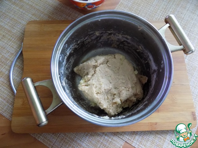 В пюре разбиваем яйцо, кладём муку, соль 0.5 ч л. Замешиваем тесто. Тесто очень податливое и к рукам не пристаёт.