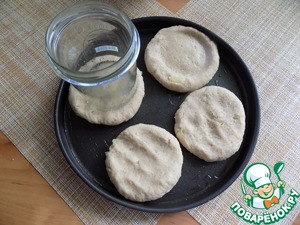 Берём противень и подмазываем его маслом. Выкладываем шарики и приплюсним их в круг. Каждый круг у меня размером в диаметре примерно 11 см. Это будет мой размер лепёшки. Смазываем маслом верх теста и подходящей банкой с плоским дном делаем углубление диаметром меньше круга, чтобы остались края примерно по 2 см. Дно банки я тоже смазывала маслом. Это для того, чтобы тесто не приставало к ней.