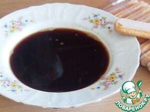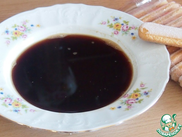 В 150 мл горячей воды растворить кофе, добавить ром или какой-то ликер, остудить. Добавлять алкоголь не обязательно, можно добавить в кофе ароматизатор. Перелить в широкую тарелку.