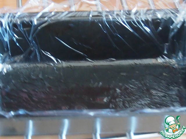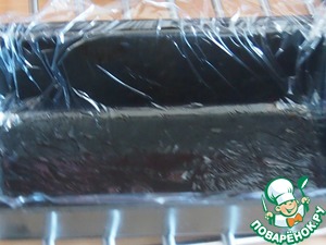 Форму для кекса смазать малым количеством растительного масла и застелить пищевой пленкой так, чтобы ее края выступали над краями формы. Масло используется для того, чтобы пленка прилипла к форме и не ерзала, также позже она поможет нам вынуть торт из формы.