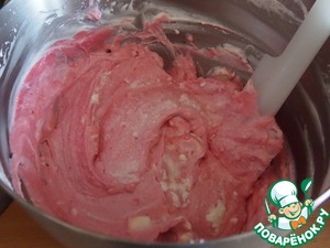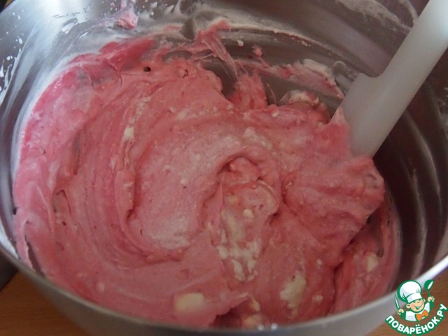 Сливки взбить до густых пиков, добавить маскарпоне и сметану, сахарную пудру и размешать. Добавить малиновое пюре. Попробуйте на сахар, если нужно, добавьте еще сахарной пудры по своему вкусу, можно добавить немного лимонного сока по вкусу. Перемешать.