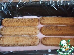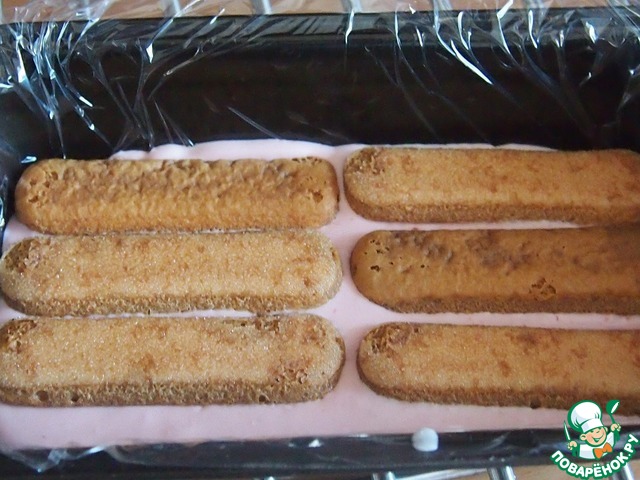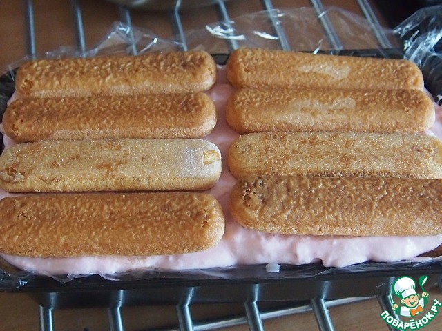 Добавить в желатин две ложки начинки, перемешать. Потом эту массу вылить в остальную начинку и перемешать венчиком. Выложить примерно третью часть начинки на дно формы. Сверху разложить печенье савоярди, смочив его в кофе с ромом.