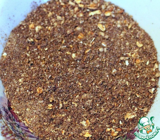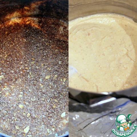 Для крошки обжарить овсяные хлопья с орехами, измельчить, смешать с сахаром и какао.