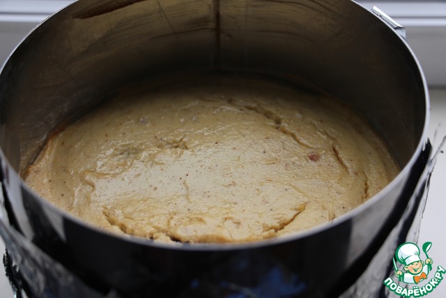 Низ разъемной формы закрыть слоями фольги и поставить в большую форму, наполненную водой. Выпекать чизкейк 75 минут при температурк 115 градусов. Готовый чизкейк остудить, убрать в холодильник на ночь.