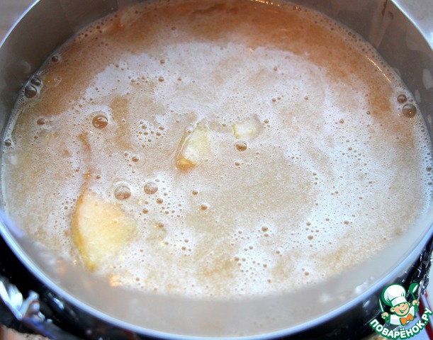 Желатин замочить в 60г воды по инструкции. Растопить в микроволновой печи, но не кипятить. Смешать с повидлом и горячей водой. Вылить поверх яблок, убрать в холодильник на ночь для стабилизации.