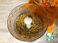 Орехи измельчить в мелкую крошку в блендере. Изюм залить горячей водой на 10 мин., чтобы он стал мягким. Кожуру апельсина потереть на мелкой терке. |