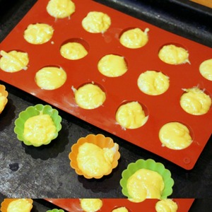 Готовое тесто разложить по 1ч. л. в силиконовые полусферы диаметром 3см или миниформочки для кексов. Оставить на 30 минут для подъема.