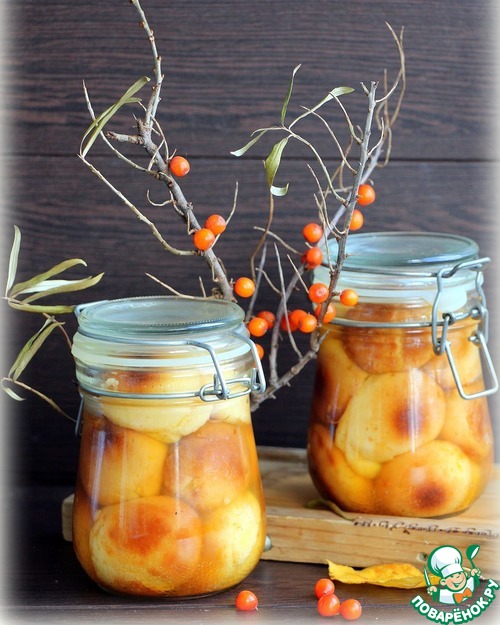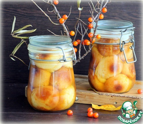 Готовую выпечку разложить в простерелизованные банки, залить горячим сиропом, закрутить крышками. Остудить и убрать в холодильник.