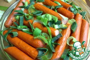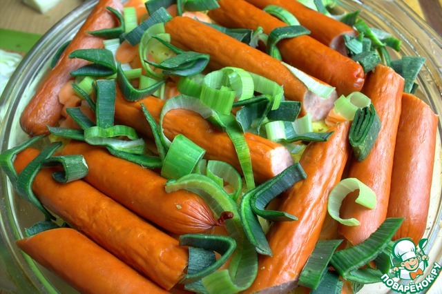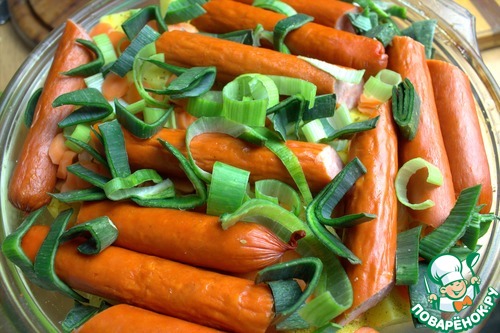 Остальное-овощи и колбаски подать на общем блюде или порционно.