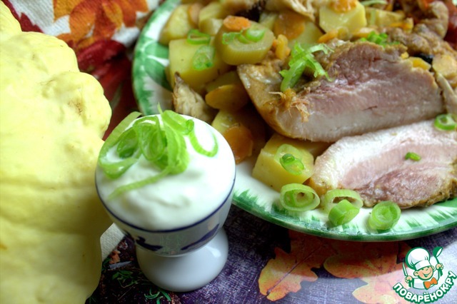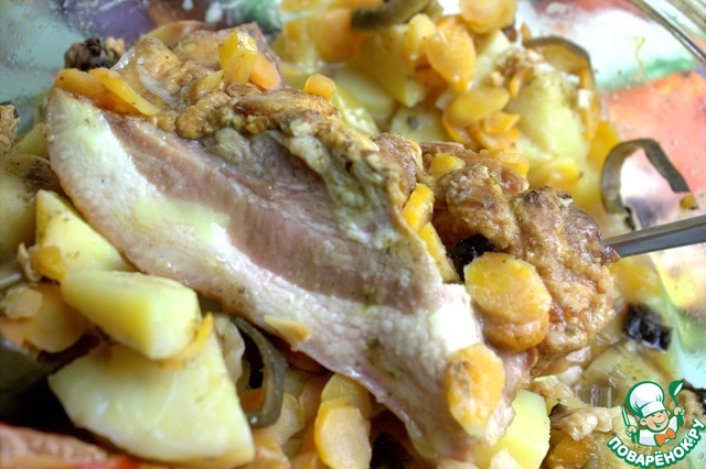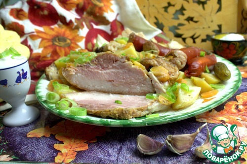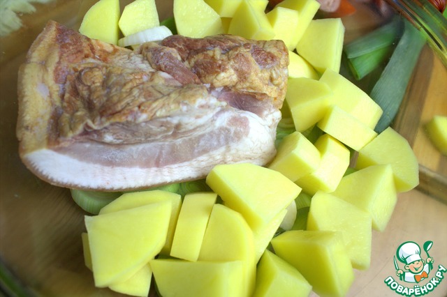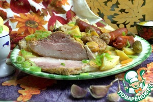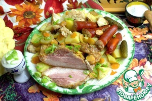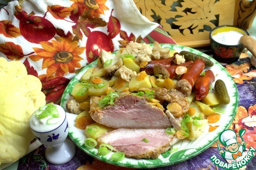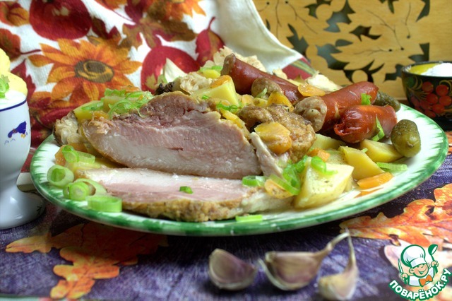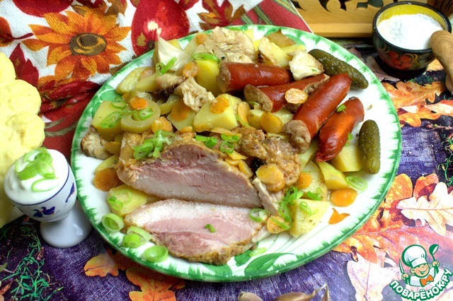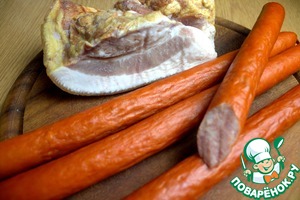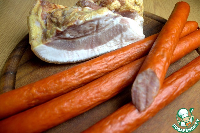 Из копчёного берём свиную щековину и колбаски. Или грудинка... копчёные рёбрышки.