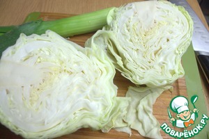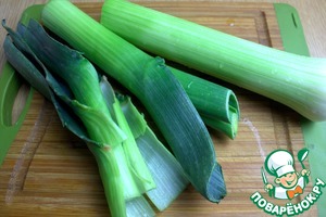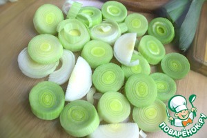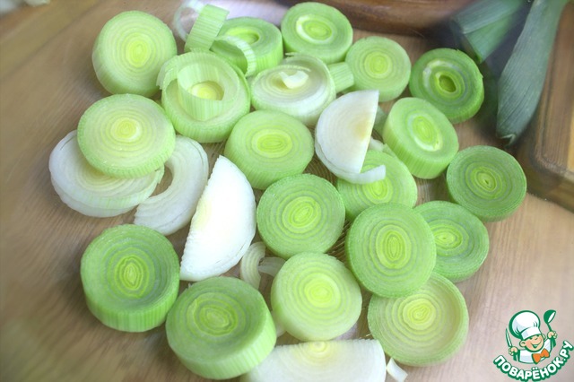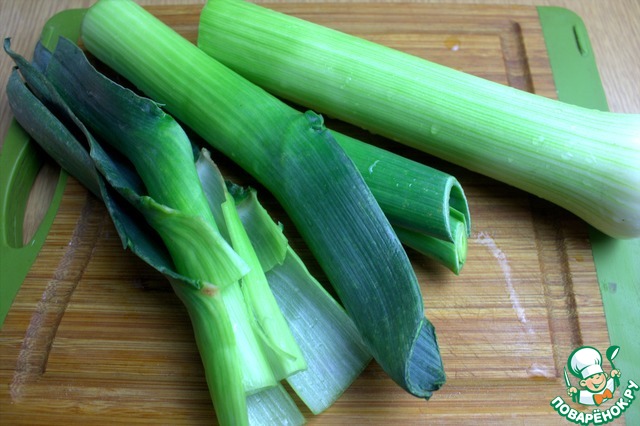 Порей разрезать пополам, потом вдоль, чтобы промыть внутри.