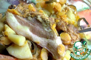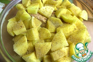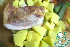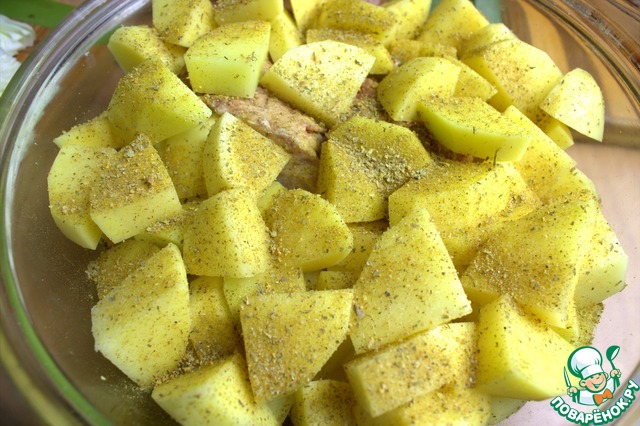 Крупный кусок поместить на лук, рядом насыпать картошку.