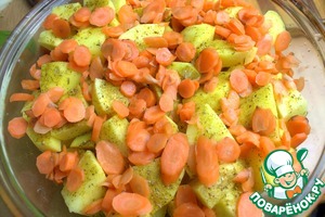 Накрыть последним слоем. Налить стакан воды, верх сбрызнуть растительным маслом. Посыпать смесью перцев.