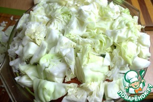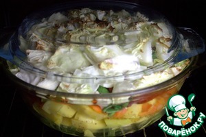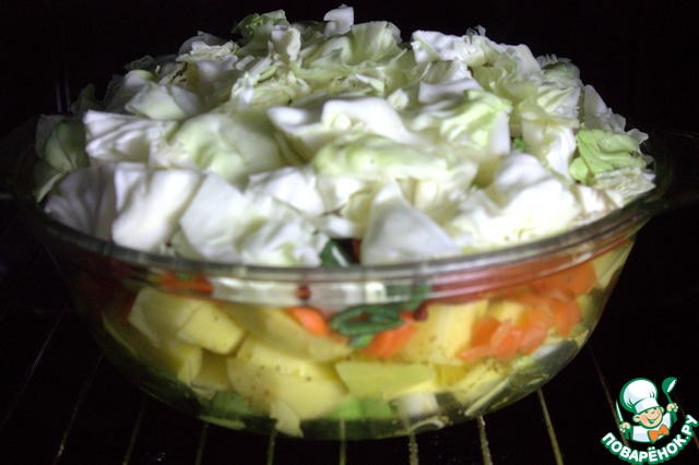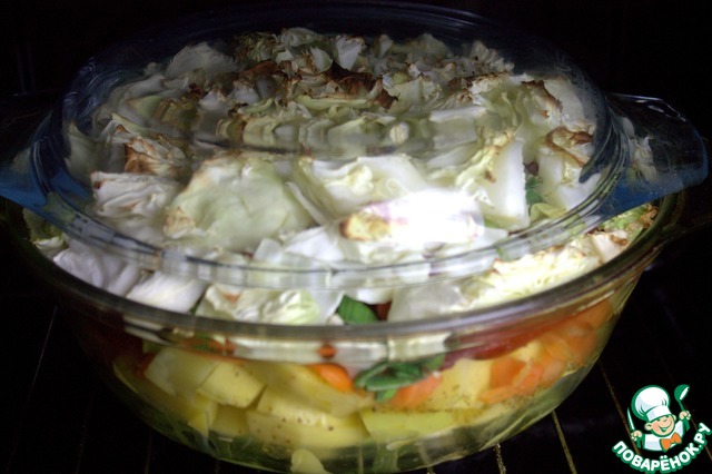 Я накрыла стеклянной крышкой. Если капуста сверху сильно пригорает, можно положить под крышку листик пергамента.