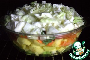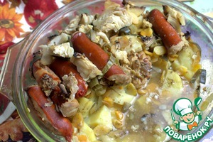 Богатое блюдо на ужин для всей семьи. Мы всегда приветствуем на столе колбаски или что-то копчёное. Здесь мне понравилось использование капусты, которая на удивление ушла первой среди моих мужчин. Удобно готовить на манер "горшочков": засыпал и жди приготовления! За идею спасибо В. Емельяненко. Заменила репчатый лук на порей.