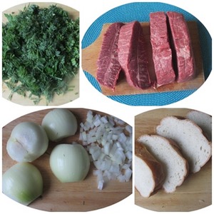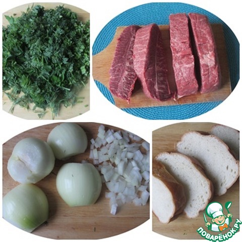 Обмытое и обсушенное мясо разрезаем на 4 толстых ломтя. Лук мелко нарезаем, зелень промываем, просушиваем и мелко шинкуем, отрезаем 4 толстых (2 см) ломтя белого хлеба. Корки можно срезать, но я оставила.