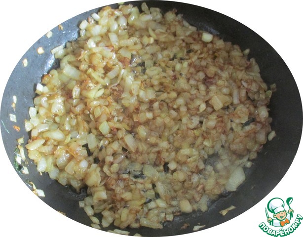 Добавляем в сковороду столовую ложку растительного масла и оставшееся сливочное. Всыпаем лук и жарим, мешая время от времени, до устойчивого румянца, минут 10. Снимаем сковороду с огня.