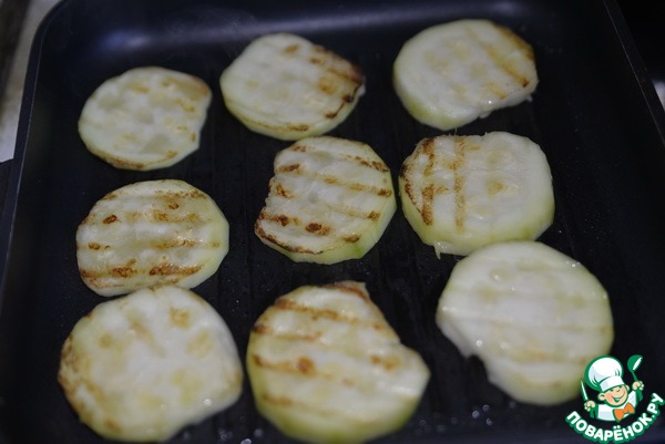 Смазываем оливковым маслом и обжариваем с обеих сторон на сковороде гриль.