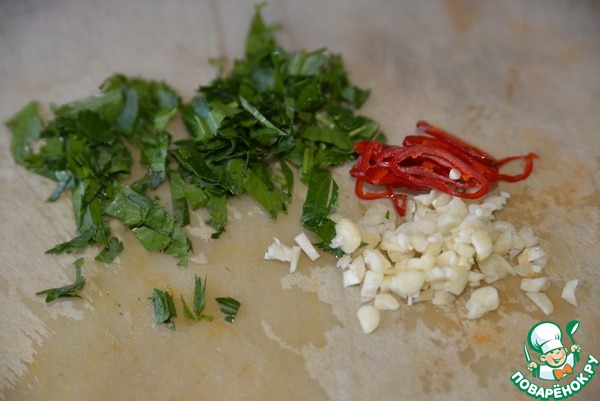 Зелень, перец и чеснок чистим, моем. Чеснок и сельдерей мелко рубим, жгучий перец режем тонкими кольцами.