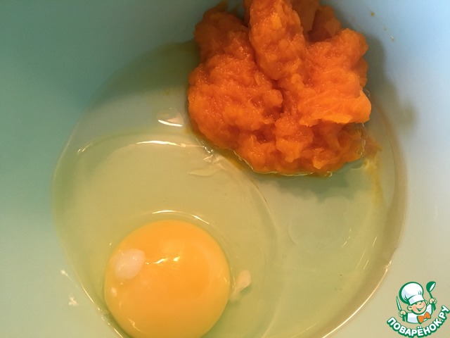 Для начала делаем тыквенное пюре (у меня уже было), чтобы получилось 100гр. Смешиваем яйцо, масло, пюре