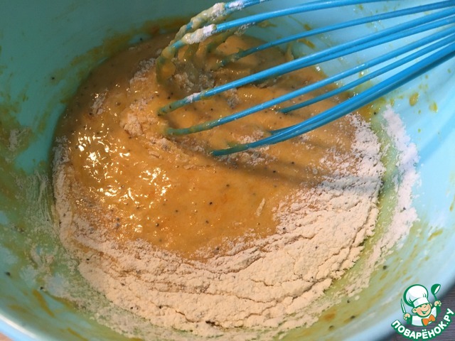 Добавляем муку, разрыхлитель, сахар, соль (я вместо всего этого использую смесь для кекса), перемешиваем