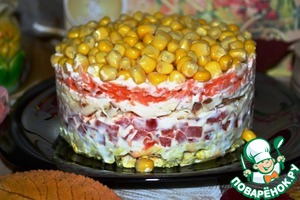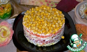 Последним слоем будет маринованная кукуруза. Поставить салат для пропитки в холодильник на 40-60 минут.