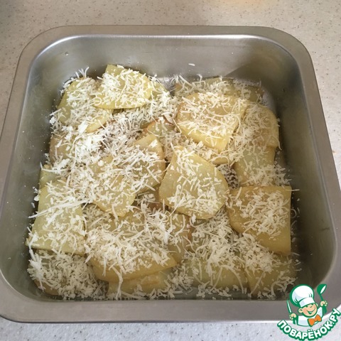 В смазанную маслом форму для запекания выкладываем слой картофеля. Солим. Присыпаем сахаром. Посыпаем сыром.