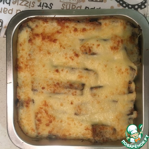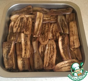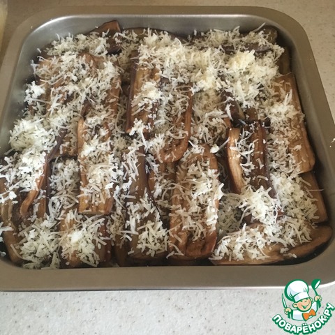 • Затем - слой баклажанов. Этот слой тоже солим и посыпаем тёртым сыром.