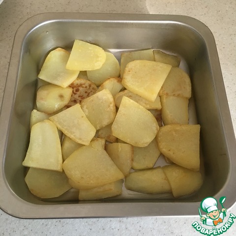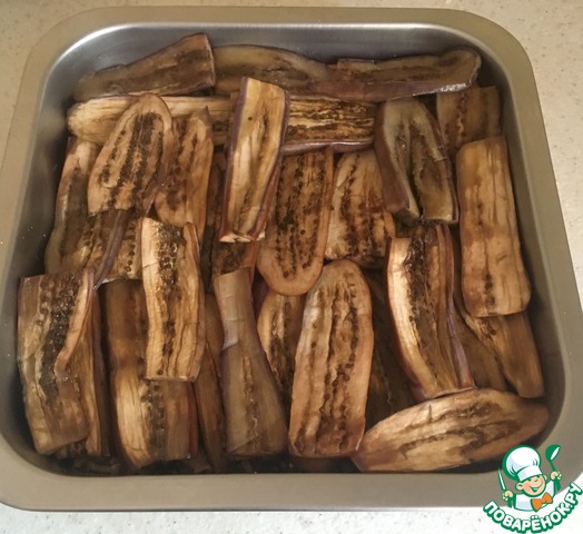 • Нарезать тонкими продольными ломтиками баклажаны и картофель. Баклажаны присолить и оставить на 20-30 минут постоять. Картофель обжарить на сковороде до румяности.