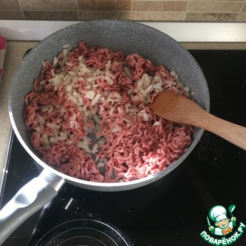 Фарш обжарить с луком на сковороде практически до исчезновения лишней влаги. Добавить вино. Специи и воду. Тушим минут 20-30 на среднем огне.