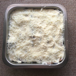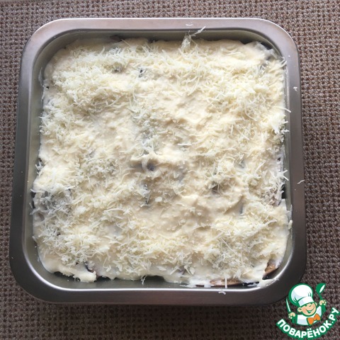 • Сверху заливаем соусом бешамель и посыпаем оставшимся сыром.