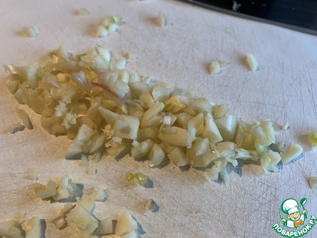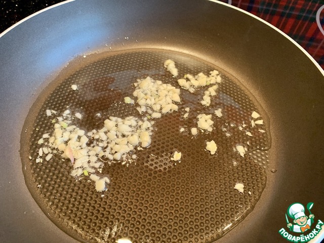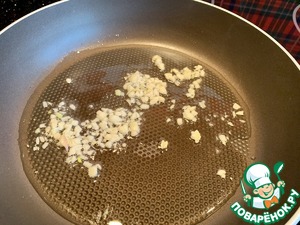 На раскалённую сковороду налейте растительное масло и обжарьте чеснок.