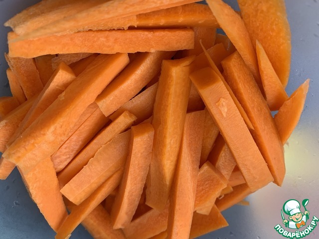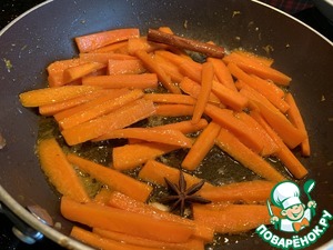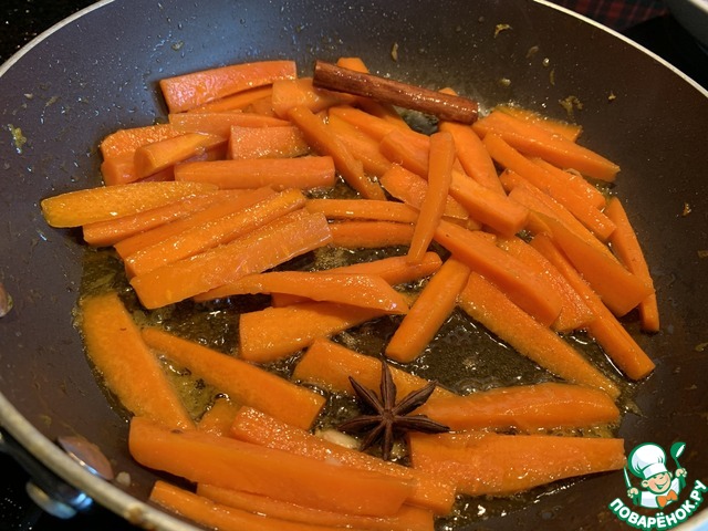 В той же сковороде приготовьте остальные овощи. Выложите в сковороду морковь, посолите и поперчите, добавьте сок половины апельсина вместе с мякотью, палочку корицы, звездочку бадьяна, мёд и приправьте молотым имбирем. Готовьте на среднем огне, все время помешивая около 12 минут. Выложите.