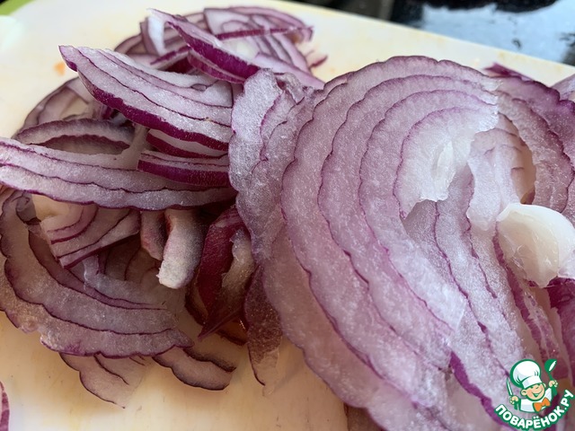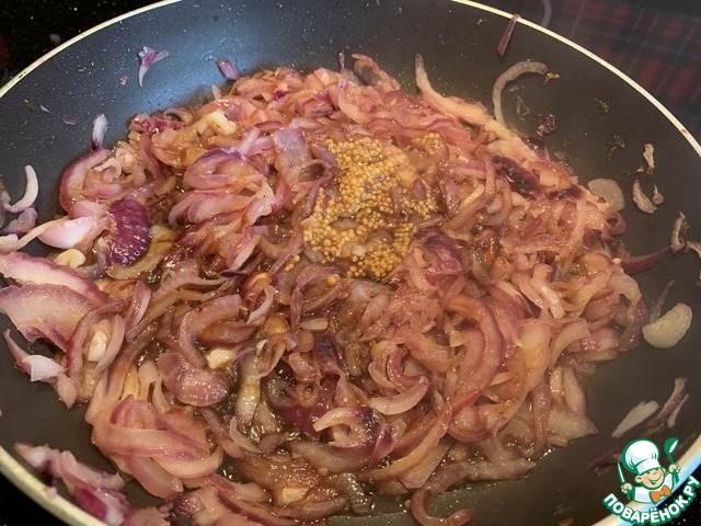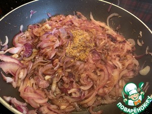 Сделайте огонь сильнее и пожарьте красный лук. Как только лук даст сок, посолите, добавьте горчицу и коричневый сахар, жарьте до тех пор пока лук не загустеет.