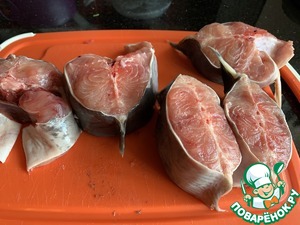 Сначала подготовим сома. Рыбу почистите, выпотрошите и разделайте на порционные куски. Голову и хвост я оставила на бульон.