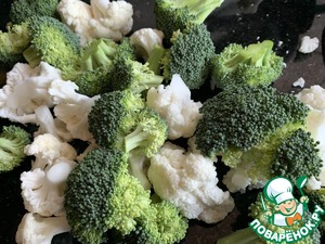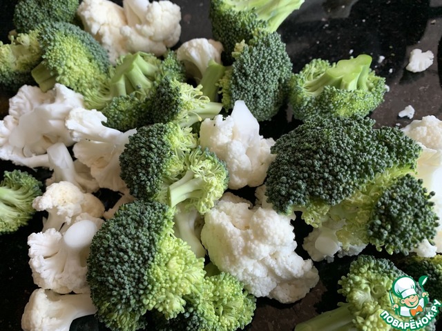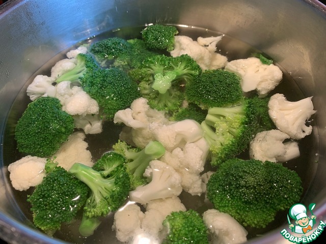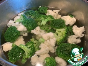 Цветную капусту и брокколи залить холодной водой и поставить на сильный огонь. Как только вода закипит откиньте капусту на дуршлаг и опустите в холодную воду. Слейте воду и обсушите соцветия бумажным полотенцем.