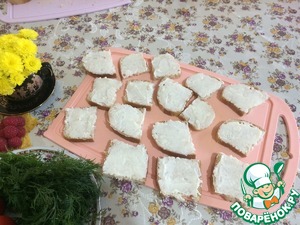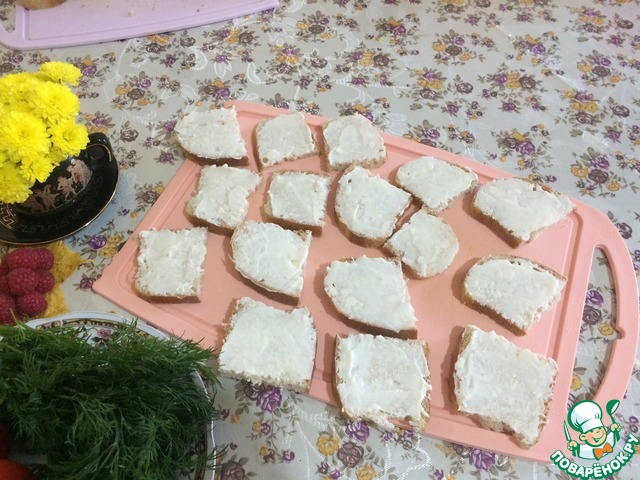 Каждый ломтик делим пополам, и намазываем плавленным сыром.
