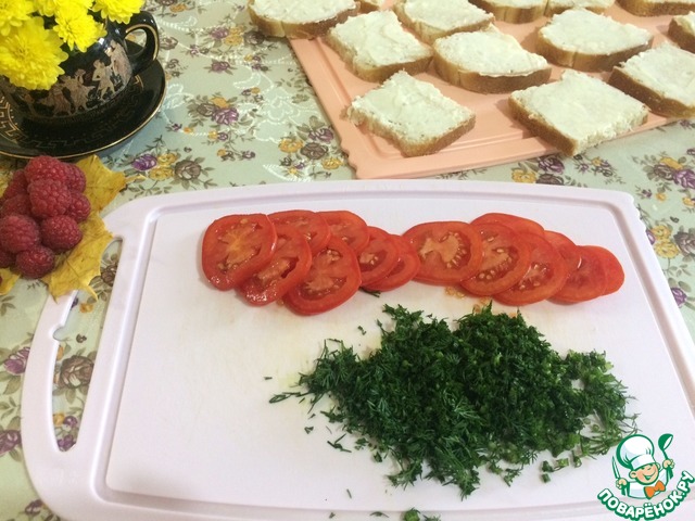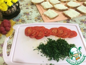 Укроп (можно взять любую зелень по вкусу) измельчаем. Помидоры нарезаем тоненькими ломтиками.