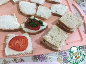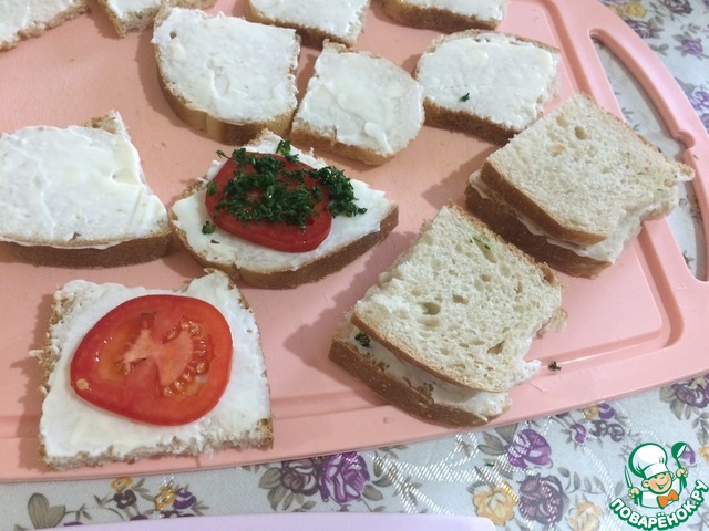 На ломтик хлеба с сыром кладём помидорку, присыпаем зеленью и накрываем вторым ломтиком хлеба. Слегка придавливаем рукой.