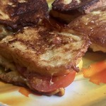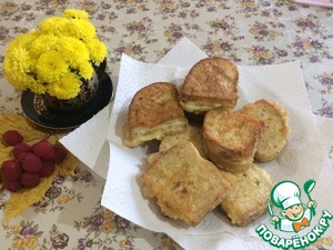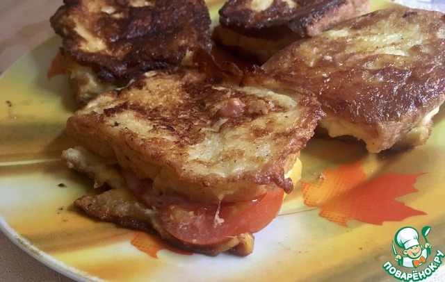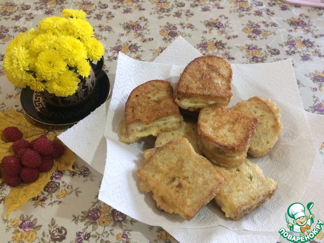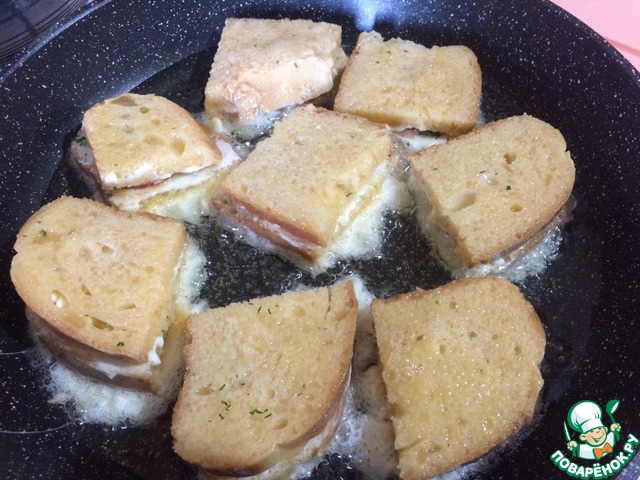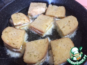 В глубокой миске яйца чуть взбиваем с солью. Каждый сдвоенный ломтик хлеба окунаем в яйцо, и выкладываем в сковороду с разогретым растительным маслом. Поджариваем с одной стороны на среднем огне. Переворачиваем, закрываем сковороду крышкой и подрумяниваем вторую сторону. Готовые гренки выкладываем на бумажное полотенце, чтобы впиталось лишнее масло.