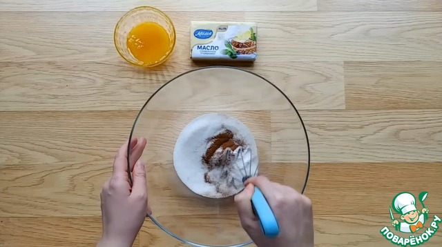 В глубокой миске смешиваем сахар, ванилин, соль и корицу. Добавляем размягчённое сливочное масло. Перемешиваем.
