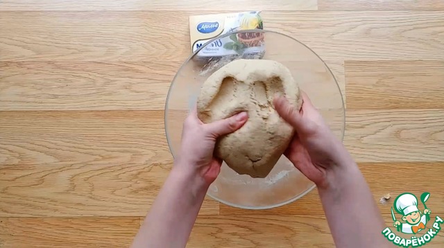 Муку смешать с содой и постепенно добавлять в тесто. Тесто должно получиться мягкое и эластичное.
