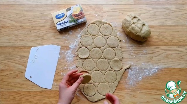 Делим тесто на две части и раскатываем пласт толщиной ~8 мм. Вырезаем печенье с помощью формы, так же можно использовать стакан.