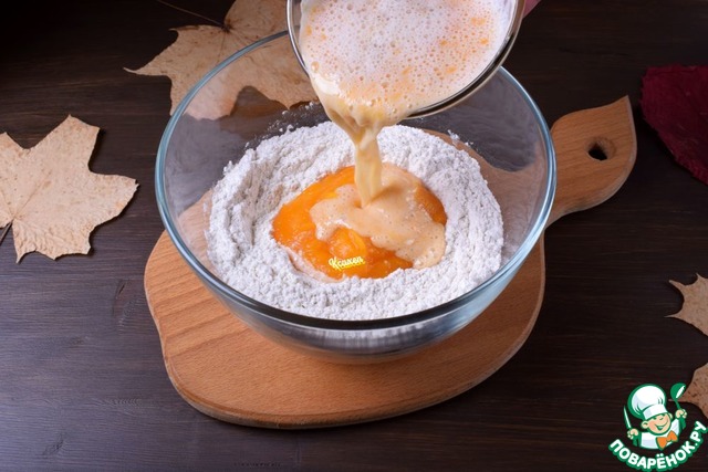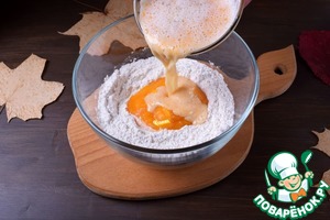 В мучную смесь добавим тыквенное пюре, желток и подготовленные дрожжи.