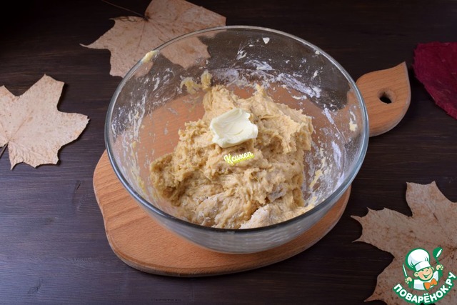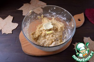 Начнем замешивать тесто. Как только сухие и жидкие ингредиенты объединились, добавляем мягкое сливочное масло, продолжая замешивание.
